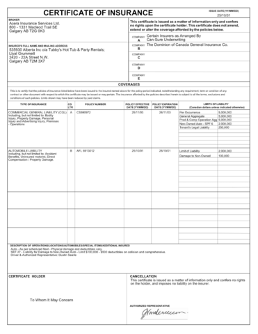 Certificate of Insurance for Commercial General Liability for 535930-Alberta Inc. O/A Tubby's 5 Million CAD